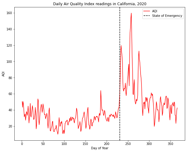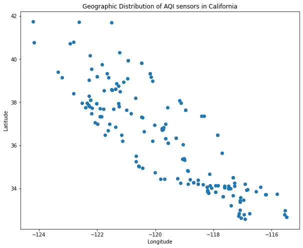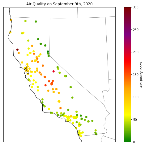 This plot gives us a good sense of which areas were worst affected by the wildfires on September 9th, 2020. Areas in the central valley suffered particularly bad air quality, with AQI reaching hazardous levels in some areas.