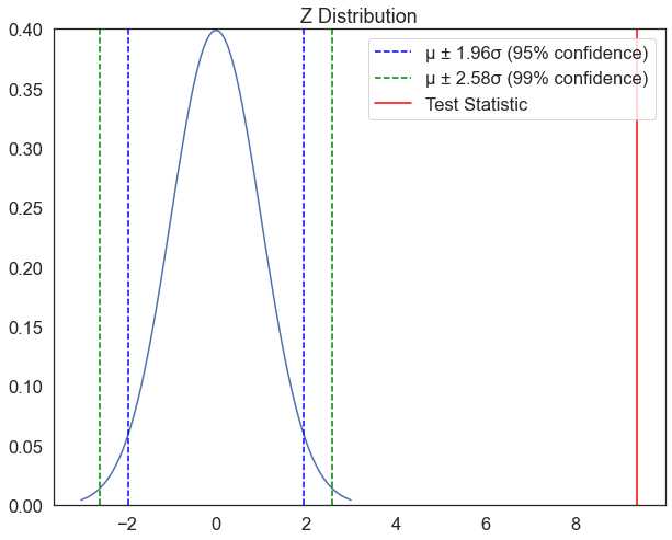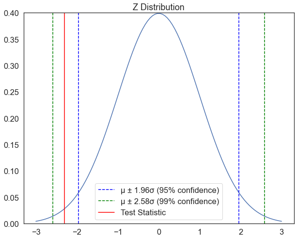 def plot_z(test_statistic): mu, se=0, 1# create two variables, a mean "mu" equal to zero, and standard deviation "se" equal to 1 x = np.linspace(mu -3*se, mu +3*se, 100) # create a range of values from -3 to 3 standard deviations plt.plot(x, norm.pdf(x, mu, se)) # plot the normal distribution plt.axvline(mu-se*1.96, color='blue', linestyle='dashed', linewidth=1.5,label='µ ± 1.96σ (95% confidence)') # plot a vertical line at the mean plus 2 standard deviations plt.axvline(mu+se*1.96, color='blue', linestyle='dashed', linewidth=1.5) # plot a vertical line at the mean minus 2 standard deviations plt.axvline(mu-se*2.58, color='green', linestyle='dashed', linewidth=1.5,label='µ ± 2.58σ (99% confidence)') # plot a vertical line at the mean plus 2 standard deviations plt.axvline(mu+se*2.58, color='green', linestyle='dashed', linewidth=1.5) # plot a vertical line at the mean minus 2 standard deviations plt.axvline(test_statistic, color='red', linestyle='solid', linewidth=1.5,label='Test Statistic') # plot a vertical line at the test statistic plt.ylim(0,0.4) plt.legend() plt.title('Z Distribution') # add a title plt.show()plot_z(-2.3)