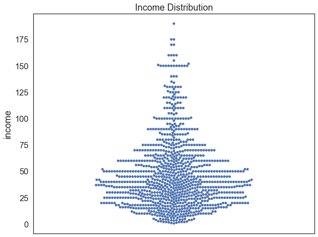 sample=df.sample(1000) # draw a random sample of 1000 observations from the dataframesns.swarmplot(data = sample, y='income') # plot a swarmplot of incomeplt.title('Income Distribution') # add a title