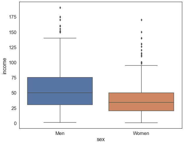 If we create a boxplot of income disaggregated by sex using our sample, we can observe that men seem to earn more than women: